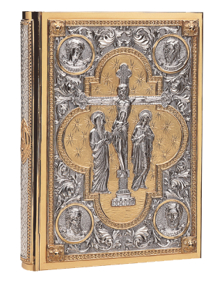 Beautiful two tone (gold & silver) Bible cover featuring crucifixion imagery.