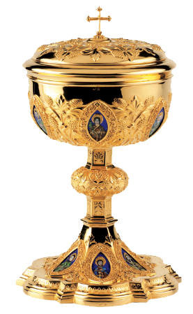 Rich filigree overlay on cup and base, with fine hand-painted fire enamel medallions, depicting the Twelve Apostles. Ciboria made in all sterling silver, gold-plated.