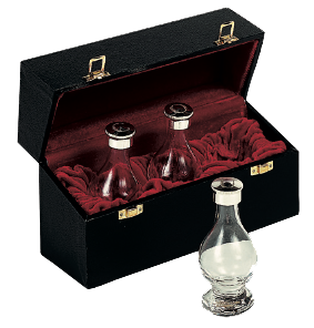 Triple glass oil stocks with silver plated screw tops and comes in a beautiful red lined case.