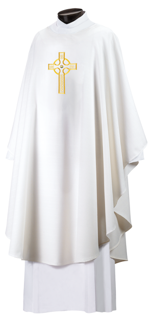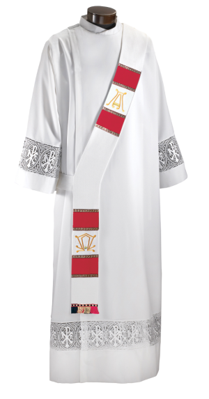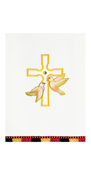 To press out any creases caused by packaging or shipping, use a steam iron set at mid-range heat and a slightly damp press cloth. Press from the back side of the parament, allowing as much steam as possible to penetrate fabric. Allow fabric to cool before removing from ironing board.
