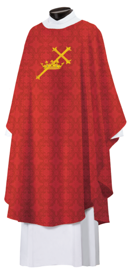 Stunning all embroidered Castle Craft chasuble available in an array of beautiful red fabrics, perfect for any Pentecost celebration.