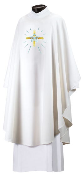 Stunning all embroidered Castle Craft chasuble available in an array of elegant white and gold fabrics, perfect for any Easter or Christmas celebration.