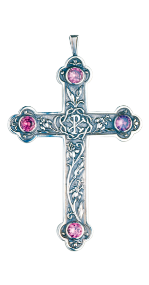 Beautiful ornate designed Bishop's cross with reconstituted amethyst gem cut stones.