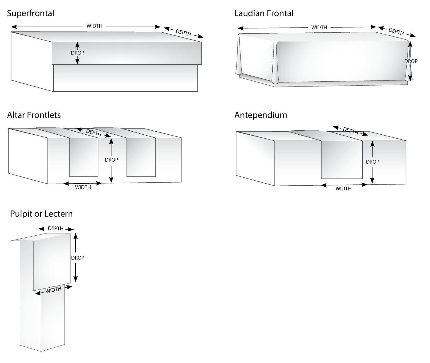 Please select below which piece you are measuring for. Then use the image on the right for direction on how to measure your parament. Note: existing paraments are not a good "measure" for your new ones. Exposure to sunlight and repeated cleaning/washing will have resulted in some shrinkage over time. Please take measurements directly from the surface to be covered. This will result in a more generous cut and precision centering of design elements.