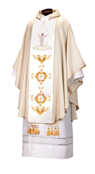If a picture is worth a thousand words, how might these faith-inspired designs move parishioners? Gaspard's exquisite Saint collection unites beautiful color, precise embroidery, and elegant Saint imagery. The vertical panels on these magnificent creations feature impeccable embroidered patterns adorned with a stunning sublimated image of Jesus atop the Chasuble. The Jesus emblem is decorated with meticulous accent embroidery to really bring the image to life and truly add that extra touch. These premier clergy chasubles, cut from sumptuous fabric imported directly from Italy, will exceed any and all expectations