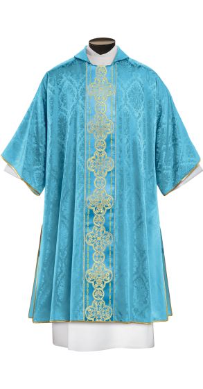 This stunning Esquiline Dalmatic series is detailed with a gorgeous single panel braid, shown with a tailored stand up collar, and bordered with our gorgeous metallic gold bias trim. All Dalmatics come with a matching understole included, detailed with beautiful metallic gold tassels to give it the perfect finishing touch. Don't forget to add a matching burse and veil for the finishing touch on your altar!