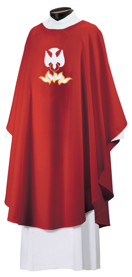 Stunning appliqué and embroidered chasuble available in an array of beautiful red fabrics, perfect for any Pentecost celebration.