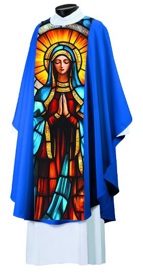 Celebrate the Feast of the Immaculate Conception with this stunning Overlay Vestment Scapular, featuring a vivid stained-glass depiction of Mary.