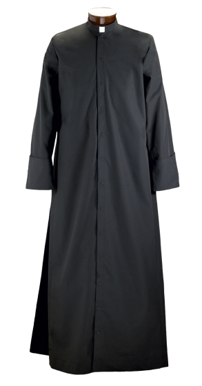 Gaspard's classic and affordable Roman style black clergy cassock is available in a variety of fabrics, with inverted back pleats, concealed slit opening to pockets and snap front. Men’s and women’s sizes in short regular and long lengths.