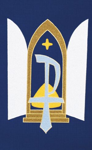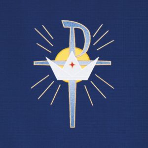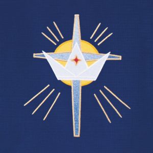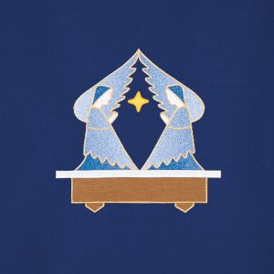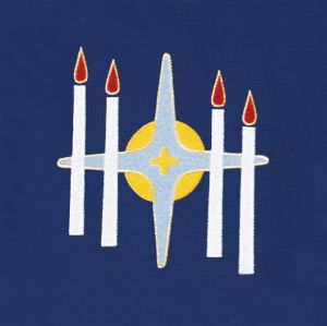 An extravagant use of color and symbols alerts us to the spectacular event which is to take place. The repetitive use of the Greek Chi Rho Symbol and the four candles is telling us that Jesus Christ is coming. Applique with Satin-Stitch Embroidery. Available for online purchase standard size only. For special size requirements please contact our friendly, knowledgeable Customer Service Representatives to assist in ordering your Paraments at 800-784-6868.