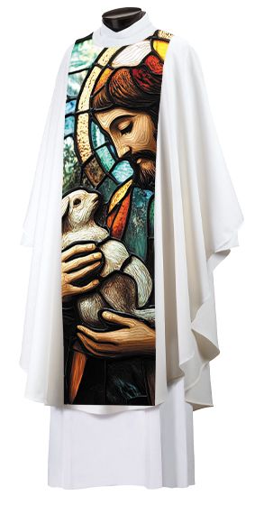 Beautiful overlay scapular vestment featuring a stained-glass style image of St. Francis of Assisi holding a lamb. Crafted with care, this piece is perfect for honoring the patron saint of animals and creation during special liturgies or feast days.