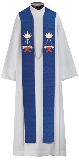 We prepare for the coming of Our Savior by using the symbols of the Jesse Tree, the City of David and the Star. Jesse, the father of David, the Town of Bethlehem and a Star were all part of the Old Testament prophecies of the Messiah Christ’s birth embodies the fulfillment of the prophecies.This stunning Gaspard stole features an outstanding rich blue background, with both appliqué and embroidery to highlight even the smallest details. We have a wide selection of fabrics available in our Fabrics Catalog.