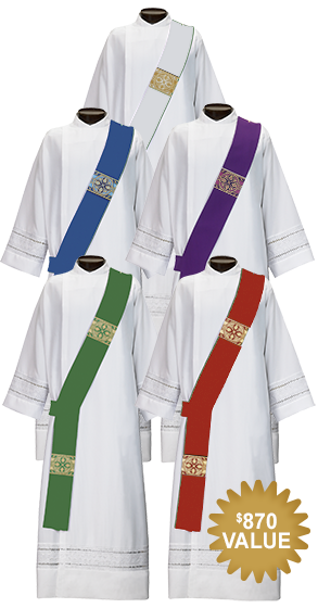 Add a touch of elegance and tradition to your liturgical wardrobe with the Regal Deacon Stole Bundle Package. This premium collection includes five stunning stoles, each featuring a double-panel braid accent that exudes sophistication and timeless beauty.Savings of up to $130.00 with this bundle deal!