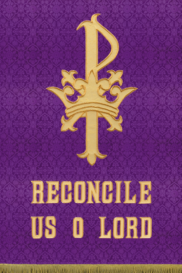 To press out any creases caused by packaging or shipping, use a steam iron set at mid-range heat and a slightly damp press cloth. Press from the back side of the parament, allowing as much steam as possible to penetrate fabric. Allow fabric to cool before removing from ironing board.
