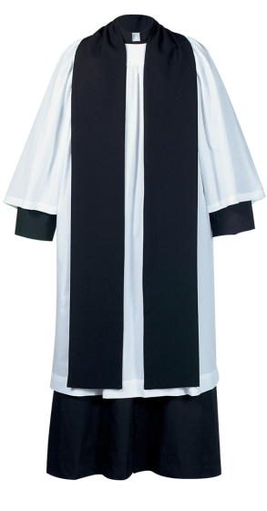 This stunning tippet is a distinguished vestment for choir officials and often adorned with one or more seminary or church symbols. It is made of ribbed faille fabric with a center closure, 2" collar opening, and the neckline is finished with beautiful sewn-in pleats.