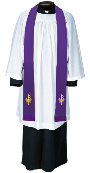 A timeless look that is beautifully executed. Meticulously embroidered and appliquéd cross design embellishes this traditional stole to further echo the season of worship. Stole features our beautiful tapered neckline and is detailed with 2" matching rayon fringe. Available in any of Gaspard's stunning purple fabrics.
