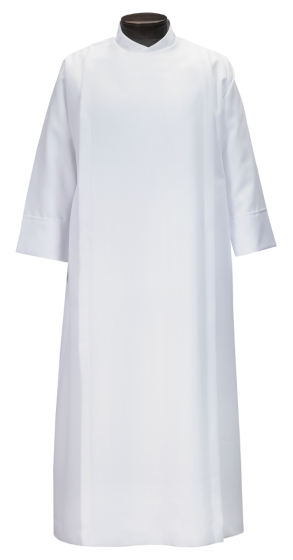Gaspard's most classic and timeless wrap-around Alb with full length opening at the side features four sewn pleats, two in front and back. An adjustable Velcro closure at neck and Velcro tabs placed below the waist preventing this style from opening at the center when seated. Comfortable, generous cut can be worn with a cincture. Also available with your choice of three stunning embroidery options at sleeves or hem, perfect for any liturgical celebration.